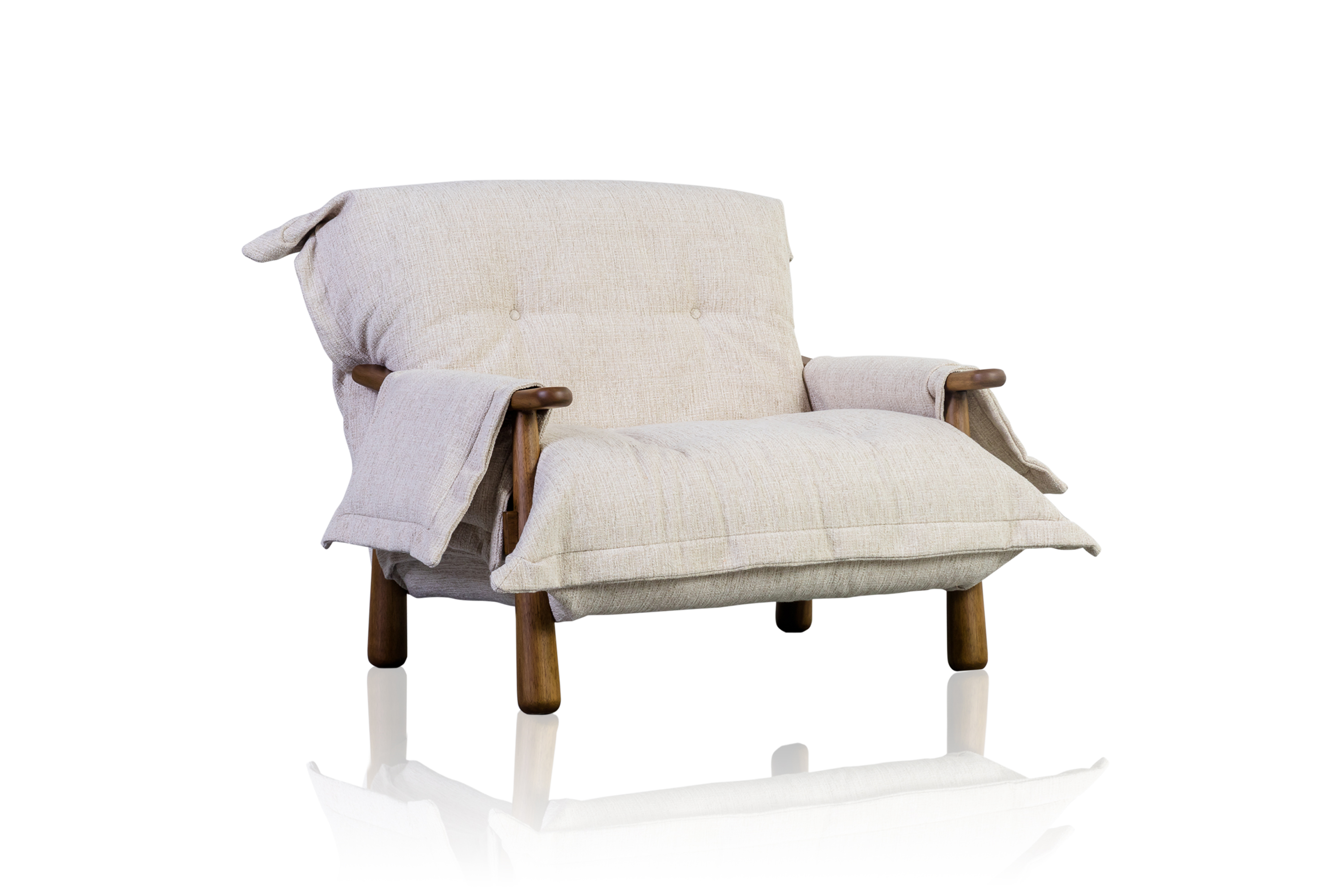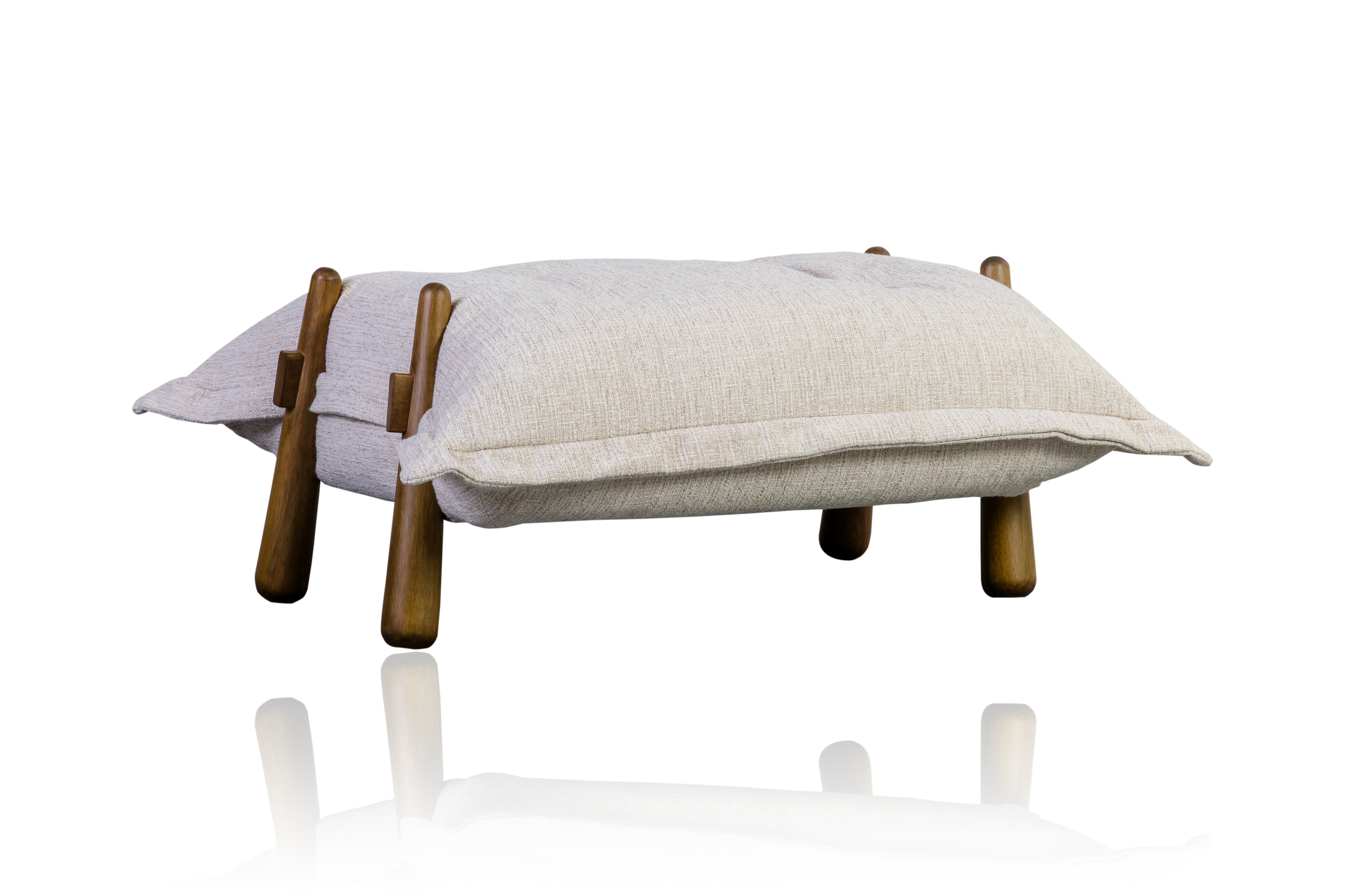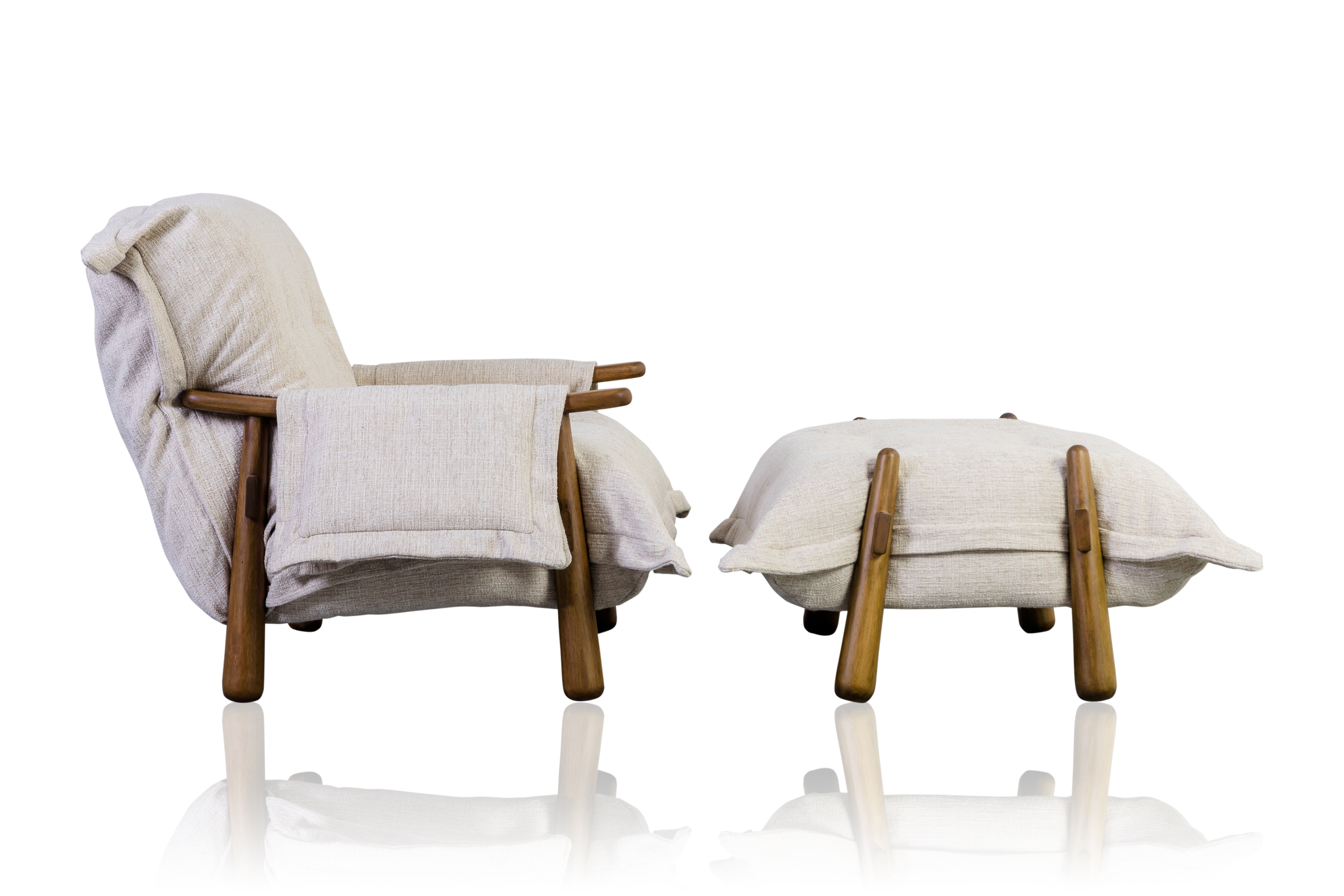 Estrutura em madeira de reflorestamento (eucalipto) com controle de umidade. Método ecologicamente correto. Na montagem da estrutura são utilizados grampos não oxidantes e cola especial e resistente. Assento fixo com espuma HR D-30 Soft, revestida com fibra de poliéster siliconada. Encosto fixo com espuma HR D-30 Soft, revestida com fibra de poliéster siliconada. Sistema de conforto - Percintas elásticas trançadas com molas Bonnel.