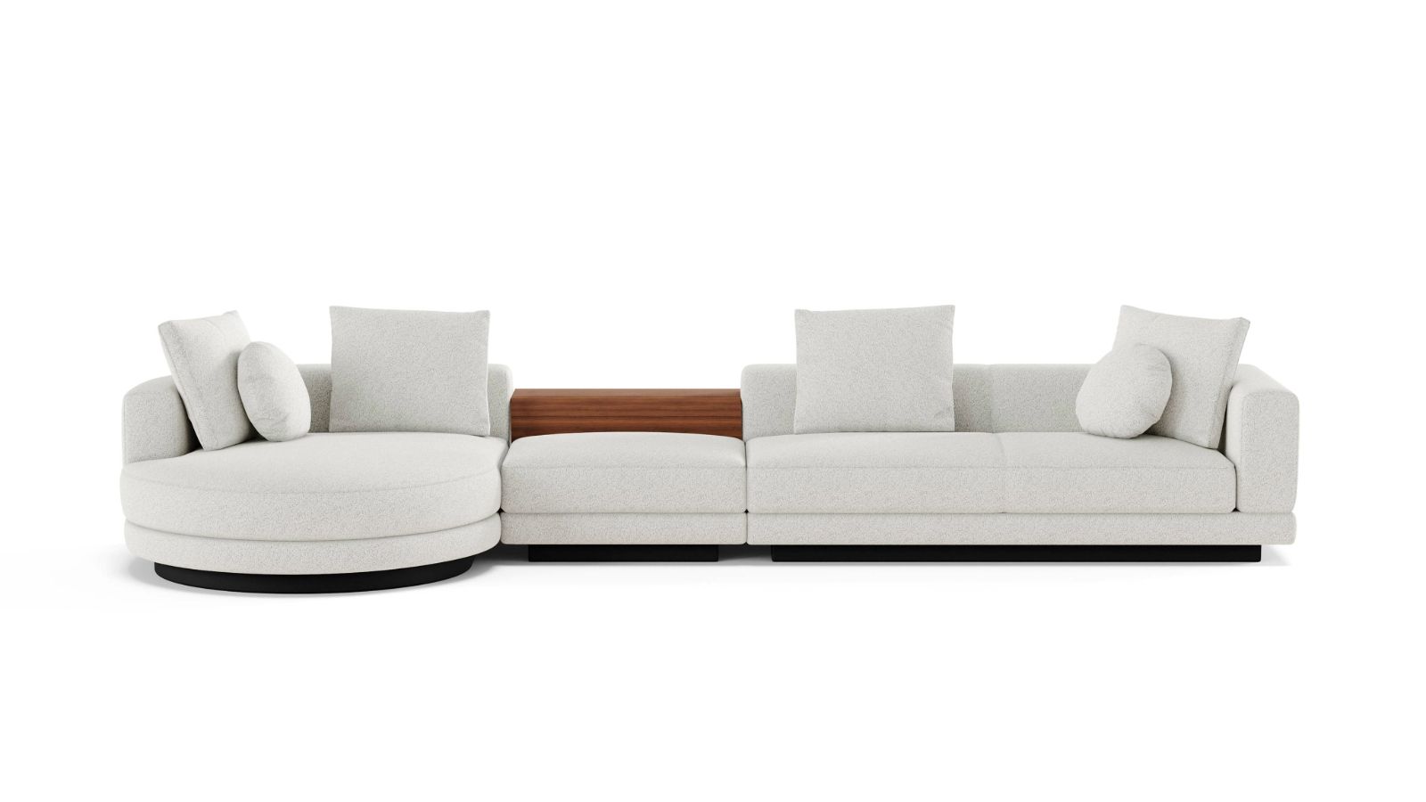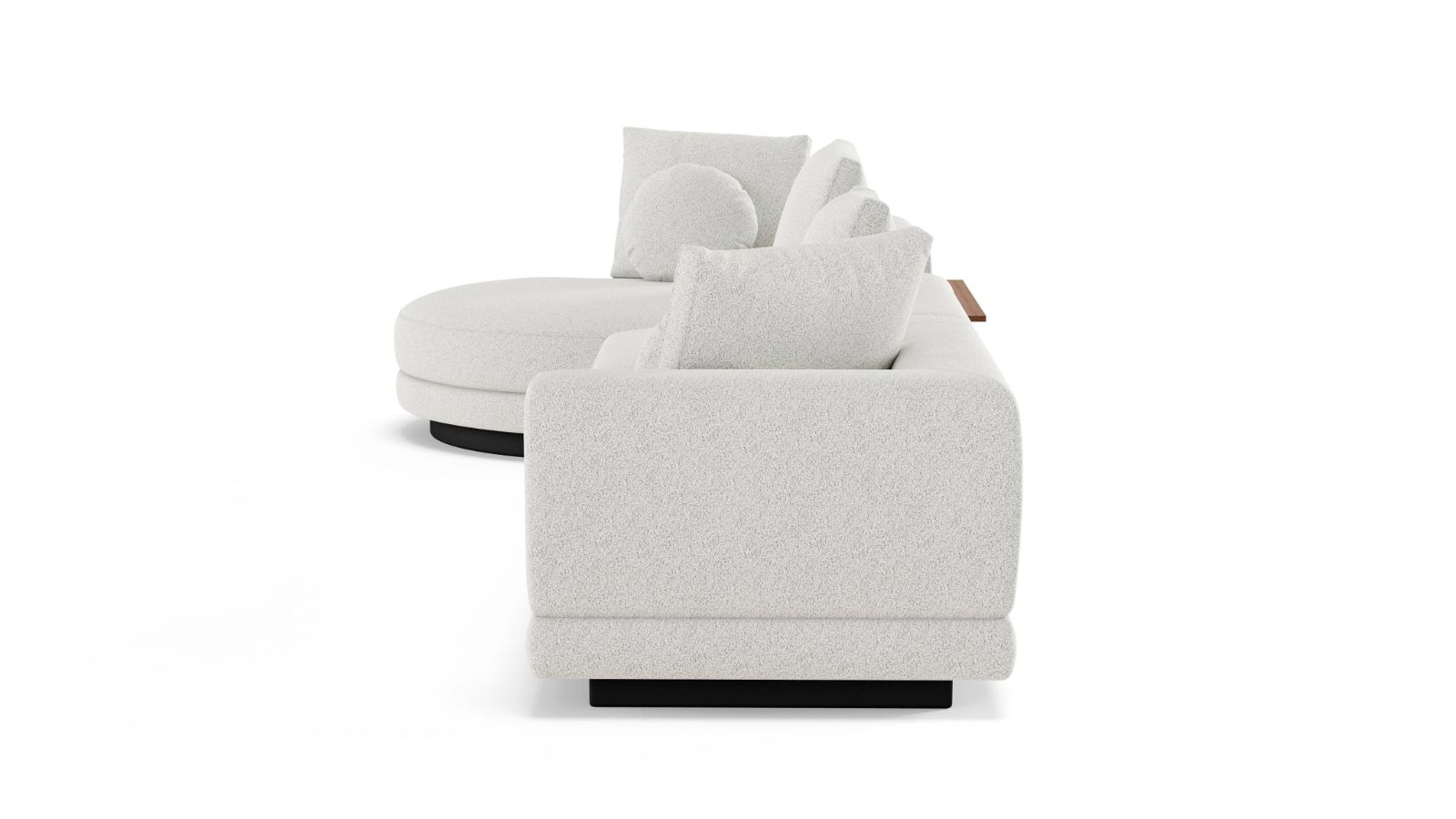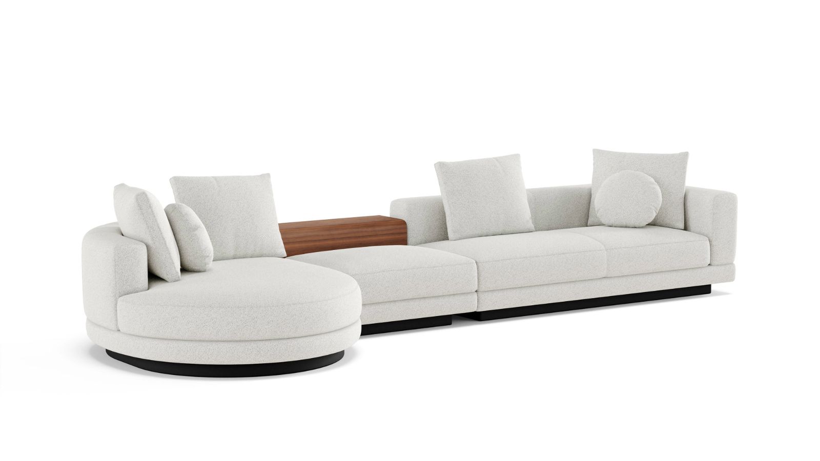 Encostos fixos com almofadas soltas em fibra de poliéster siliconada.